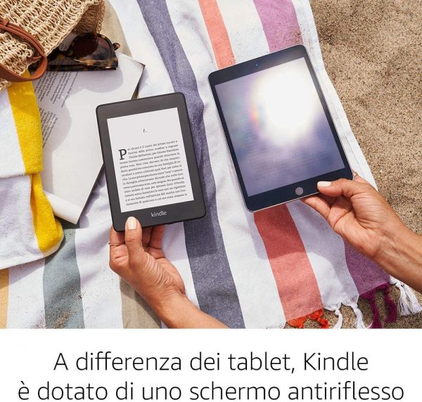Resistente all’acqua (IPX8), per leggere e rilassarti in spiaggia, in piscina o nella vasca da bagno. Il dispositivo Kindle è stato testato per resistere a immersioni accidentali in acqua.